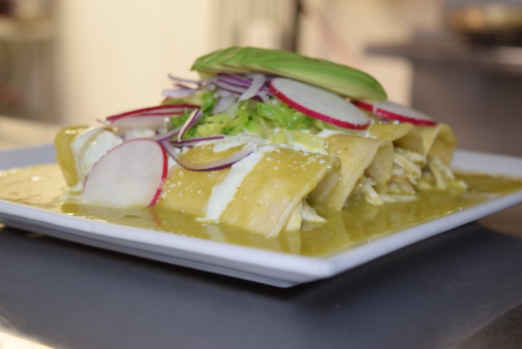 Corn Tortillas Stuffed with Cheese Topped With Your Desired Sauce (Homemade Mole, Green or Habanero Sauce ) You Can Add Chicken, Steak, Shrimps or Carnitas