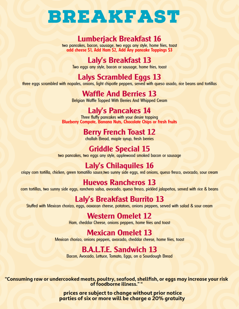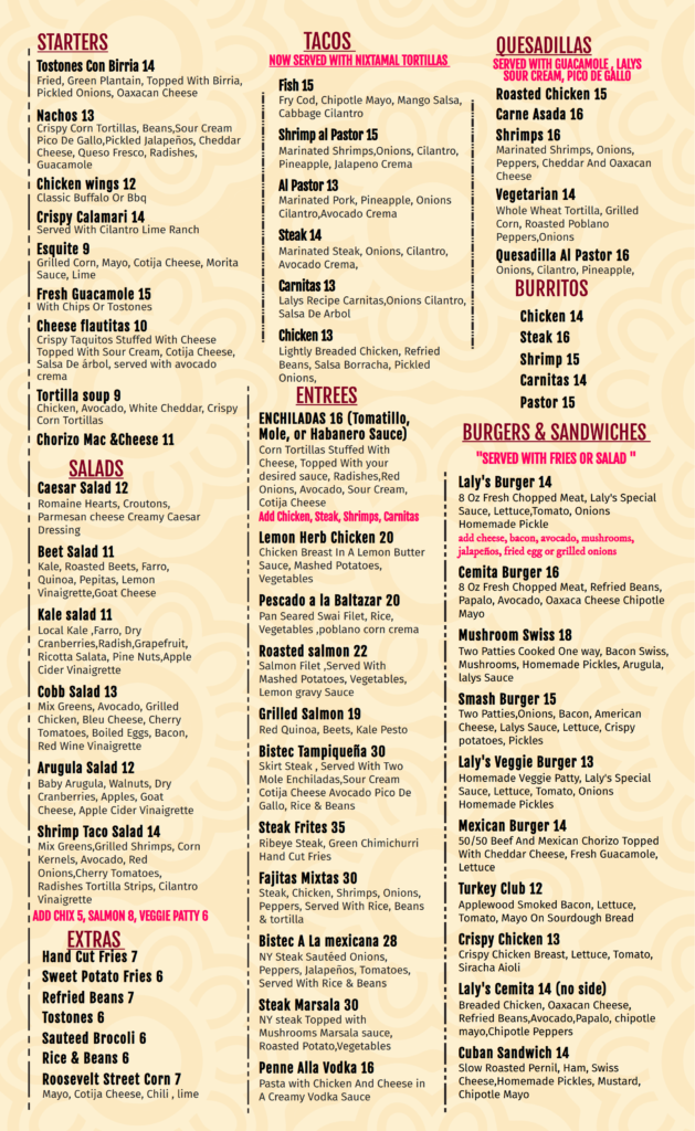 SUPPORT LOCAL RESTAURANTS ORDER BY PHONE (718)433-9906 info@lalysrestaurant.com lalysrestaurantny.com